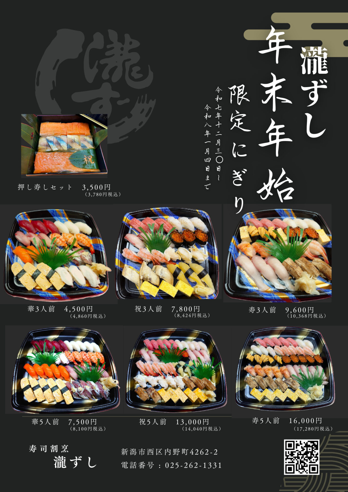 2025年瀧ずし年末年始限定にぎりのご案内✨年末年始だけの特別なお寿司を、ご家庭に。 一年の締めくくりと新しい年の始まりに。瀧ずしでは、年末年始限定にぎりをご用意いたしました。 厳選した新潟の幸を中心に、職人がひとつひとつ丁寧に握り上げた特別な盛り合わせ。晴れの […]