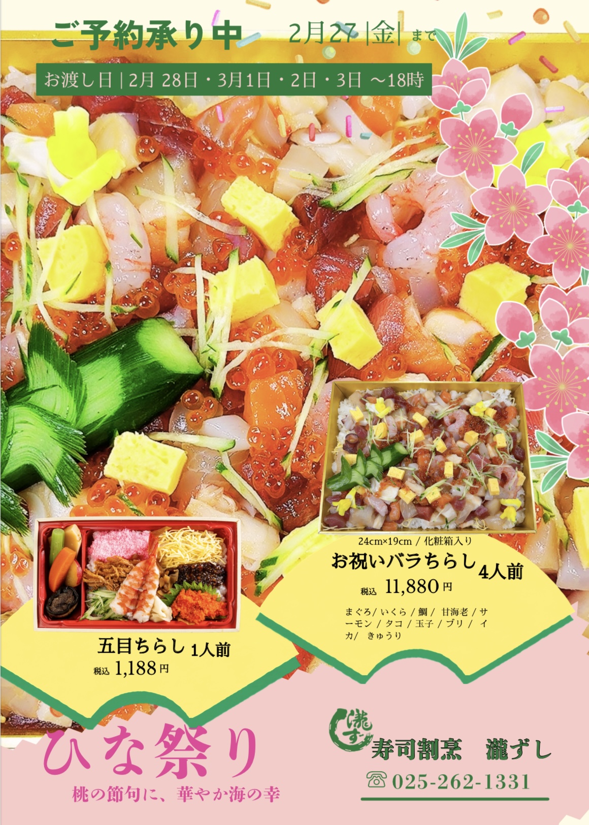 ひな祭り限定「お祝いバラちらし」のお知らせいつもお世話になっております。瀧ずしでございます。 3月3日は桃の節句。 ご家族の健やかな成長を願う特別な日に、華やかな海の幸を贅沢に盛り込んだちらし寿司はいかがでしょうか。 現在、ひな祭り限定商品のご予約を承っておりま […]